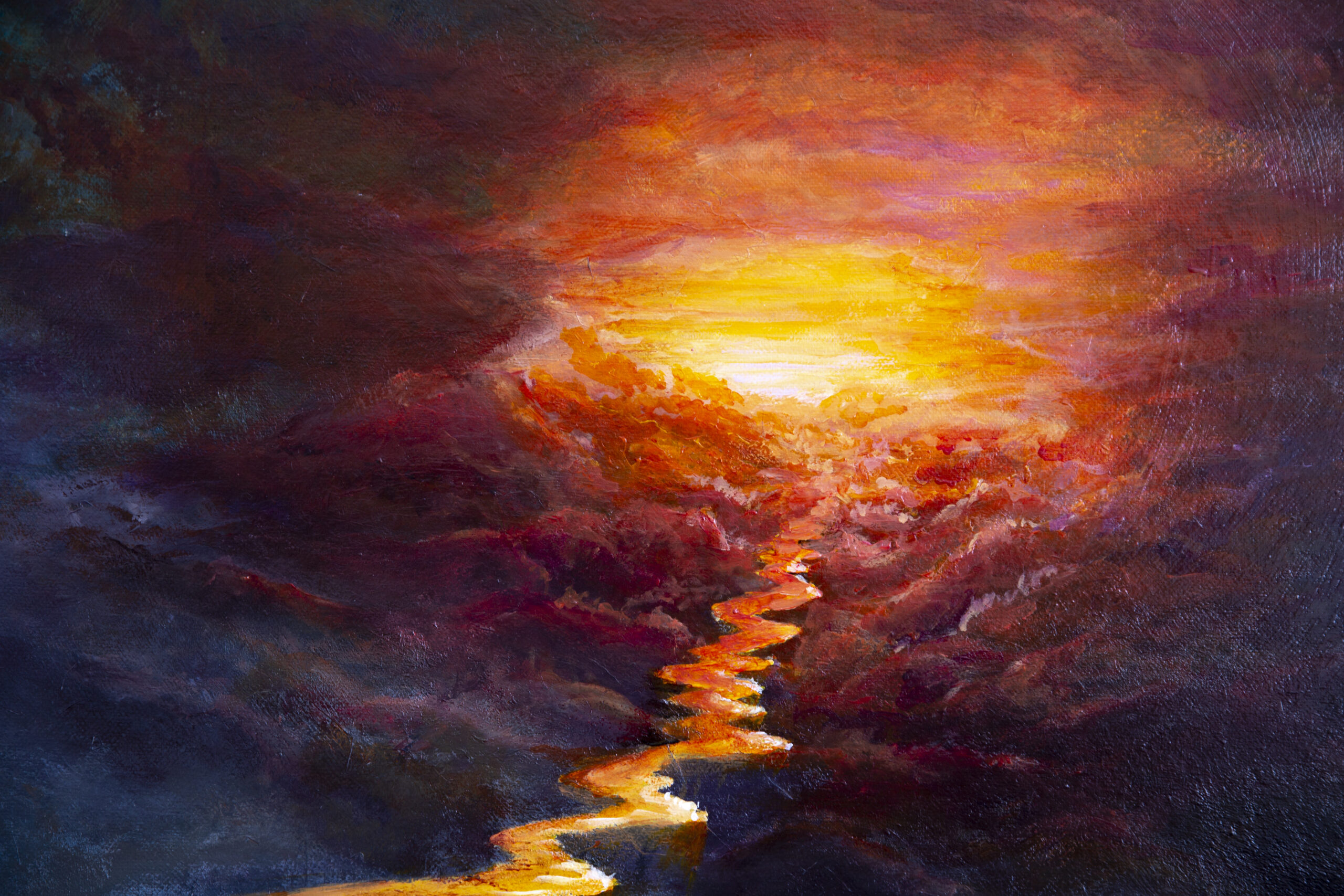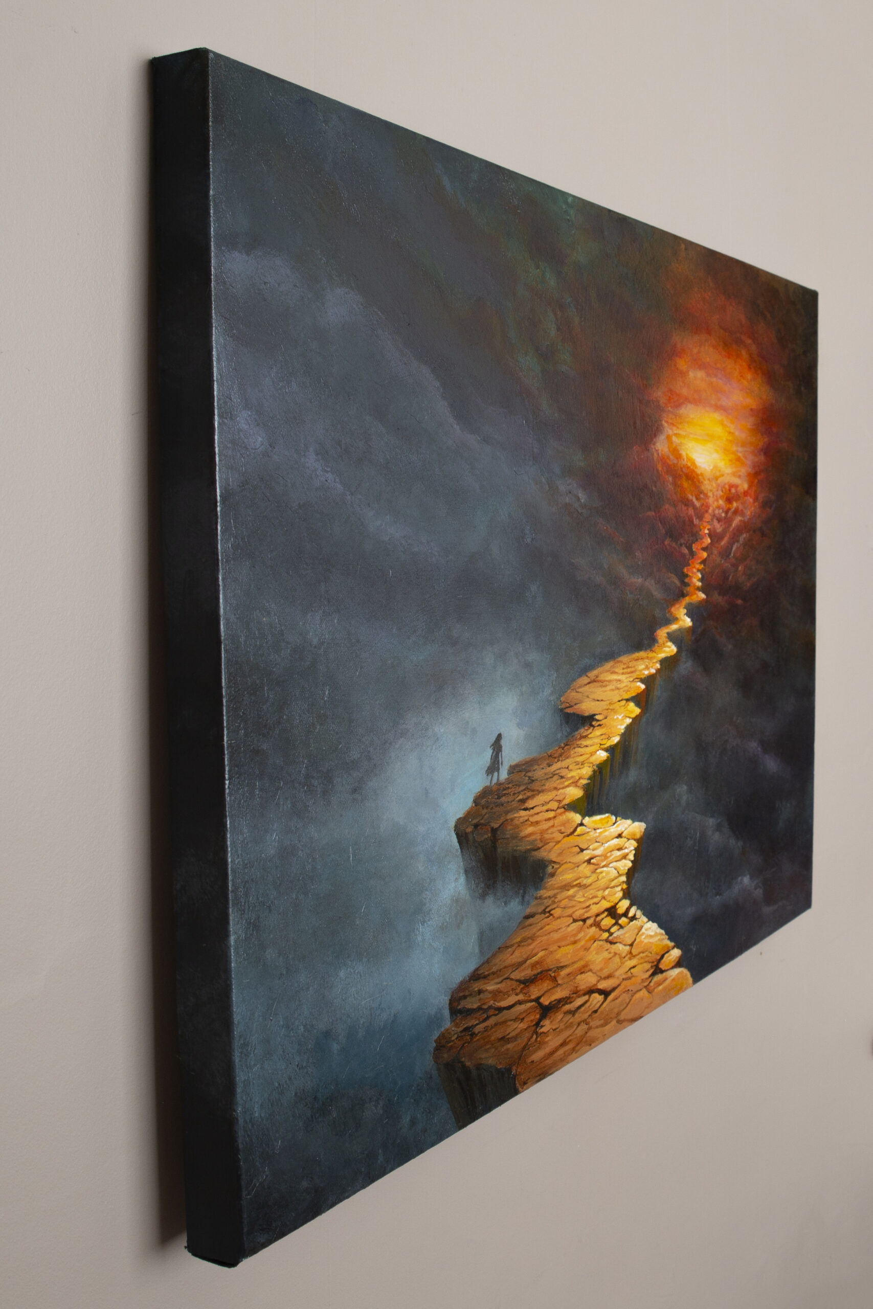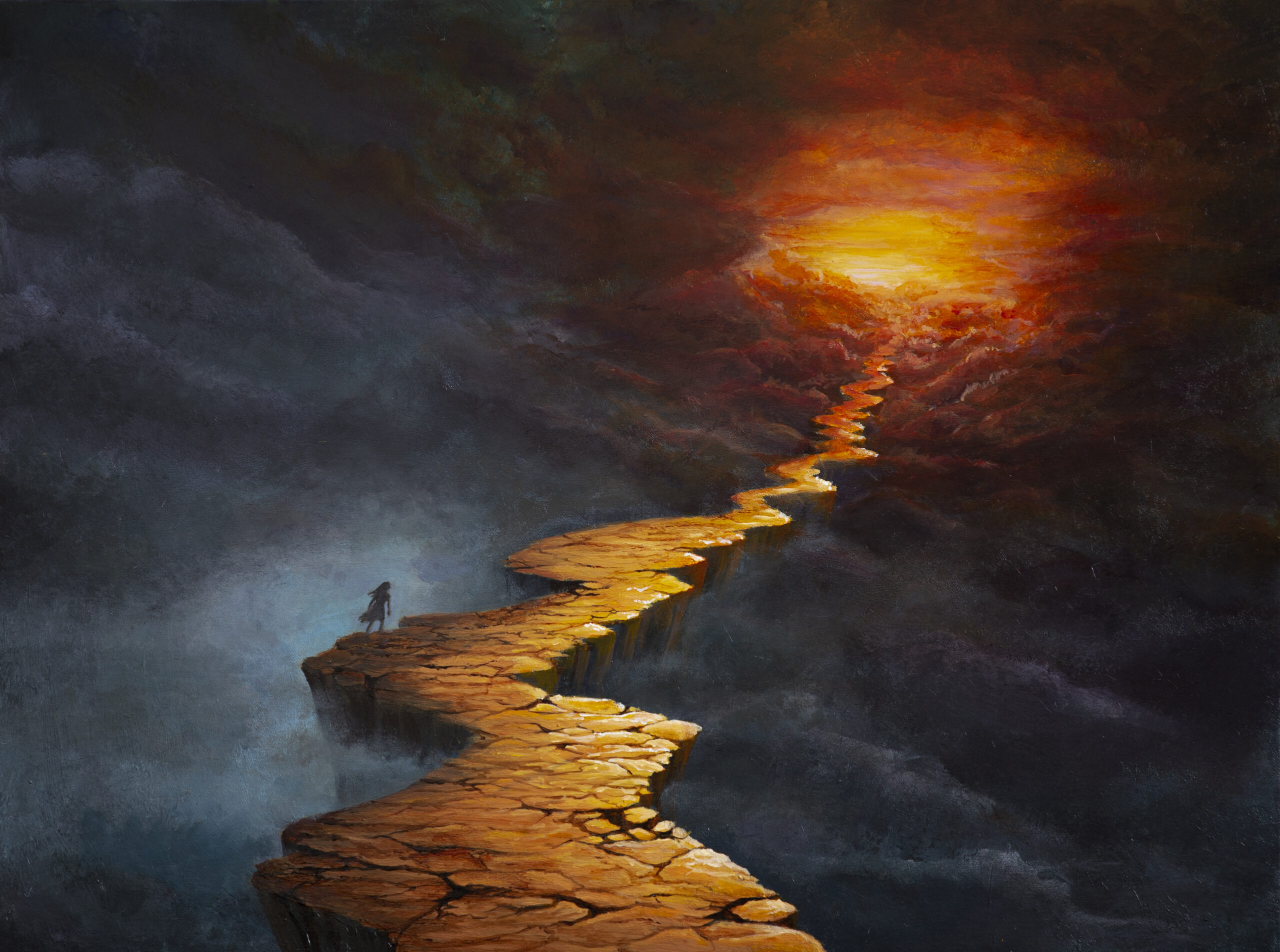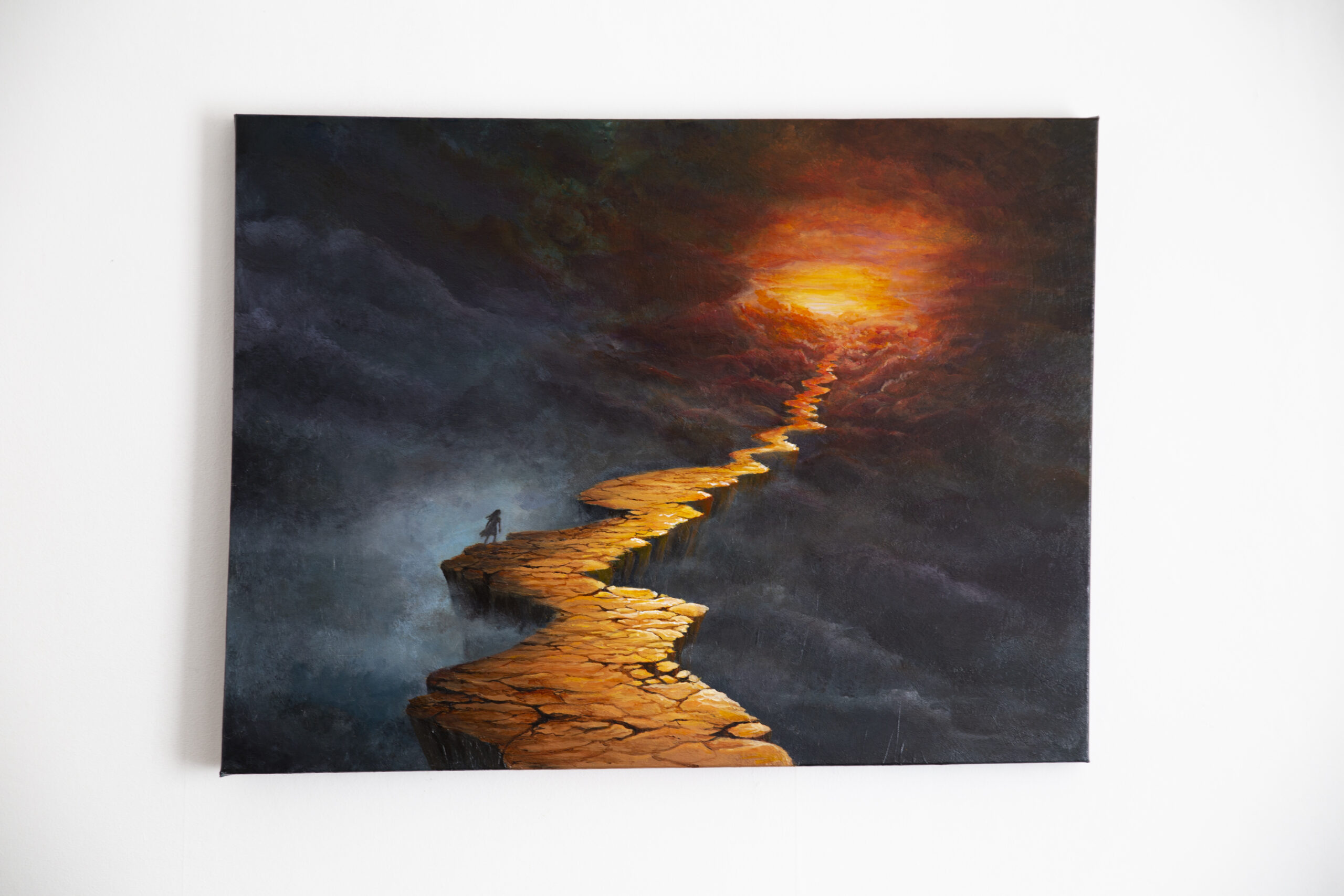 Suspended in a vast, shadowed space, a solitary traveler walks a broken, winding path. Each step carries both uncertainty and hope, as the distant horizon glows with promise. “Call of the Horizon” captures the tension between fragility and resilience, darkness and light, inviting the viewer to reflect on the courage it takes to move forward into the unknown.